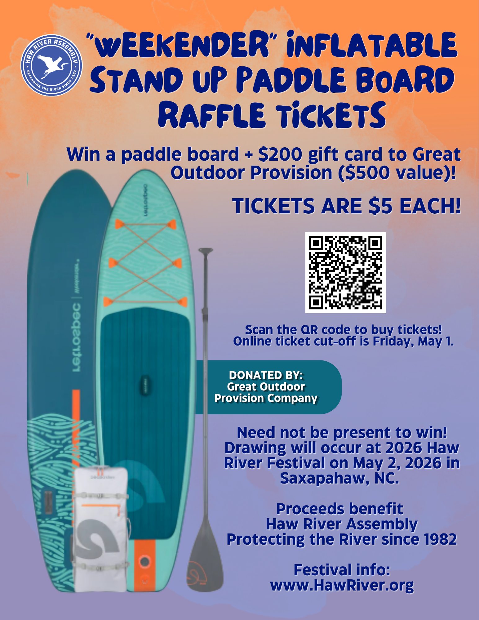 Join us for this year's Haw River Festival, kicking off Saturdays in Saxapahaw with live music, a giant puppet parade, stand-up paddleboard raffle, canoe rides, stream monitoring, river walk, food trucks, and farmers market. Thanks to Haw River Ballroom, Paperhand Puppets, and Haw River Canoe and Kayak for making this event possible. Save the date!