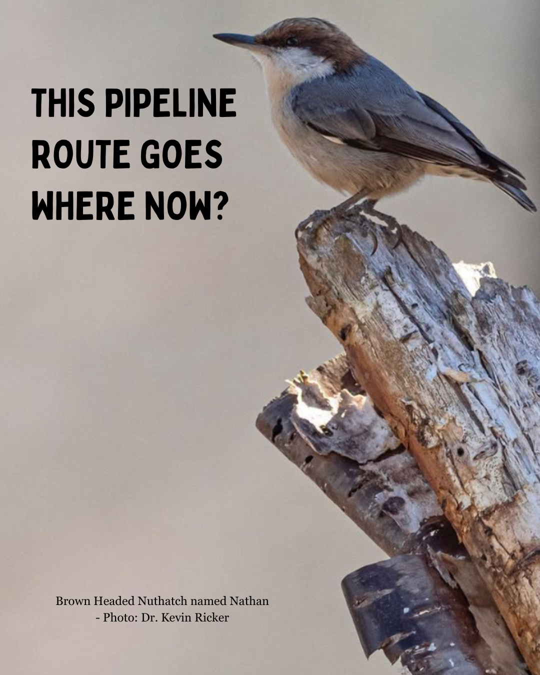 Neighbors in Rockingham, Guilford, Forsyth, and Davidson counties (and the Haw River headwaters) face a pipeline using the "dry-ditch, open-cut" method. Nathan, the brown-headed nuthatch, knows this is a bad idea. The method destroys and rebuilds stream channels, causing erosion, sediment pollution, habitat loss for endangered species, and threatening downstream drinking water supplies.