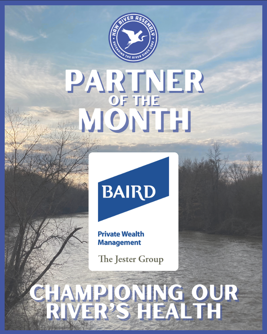 For nearly a decade, The Jester Group at Baird has been a cherished friend and sponsor of Haw River Assembly. David Jester and his team have generously contributed time, resources, and family participation to our Clean-Up-A-Thon and Haw River Island Ramble. David previously served on our Board and now guides us as a financial advisor. We're deeply grateful for their model of corporate giving and proud to call them friends. |