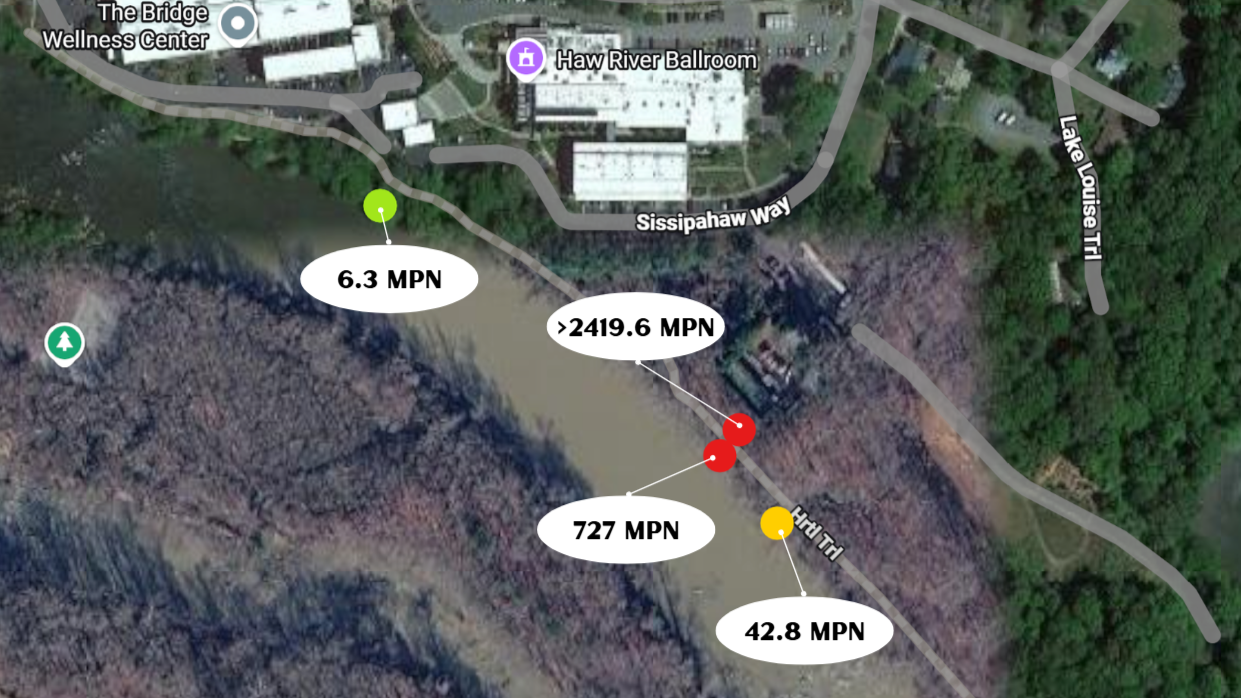 From the effluent pipe we once again saw extremely high levels at over 2419.6 MPN (higher than what we can measure). This contaminated water trickles down from the pipe a short distance to the Haw River, where we found E. coli levels at 727.0 MPN. About 50 feet downstream, the levels dropped to 42.8 MPN. While still higher than the upstream levels, this is still within safe swimming range. |