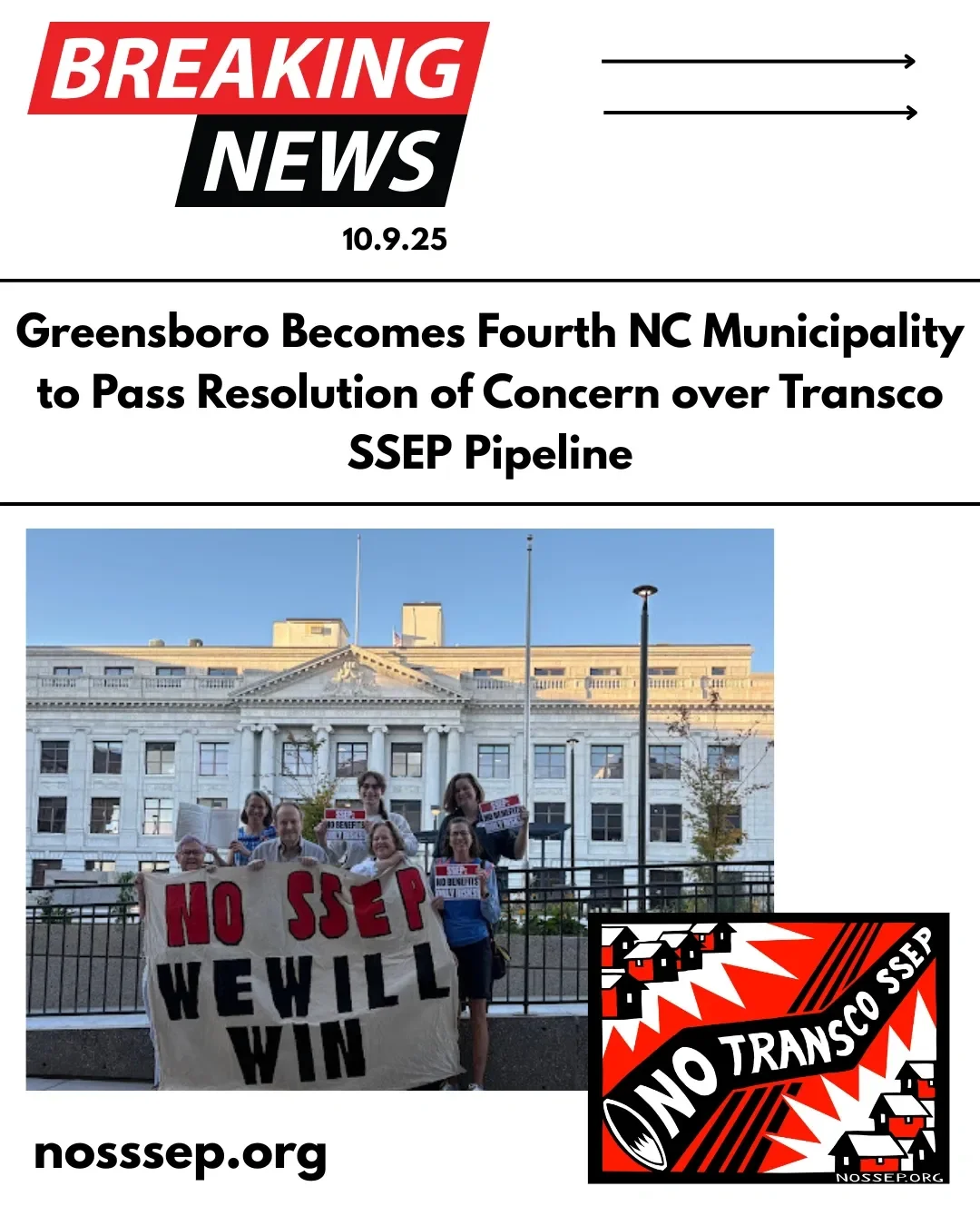 Thanks to grassroots pressure, the Greensboro City Council has passed a unanimous resolution of concern over the proposed Transco-Williams Southeast Supply Enhancement Project (SSEP) methane gas pipeline.
