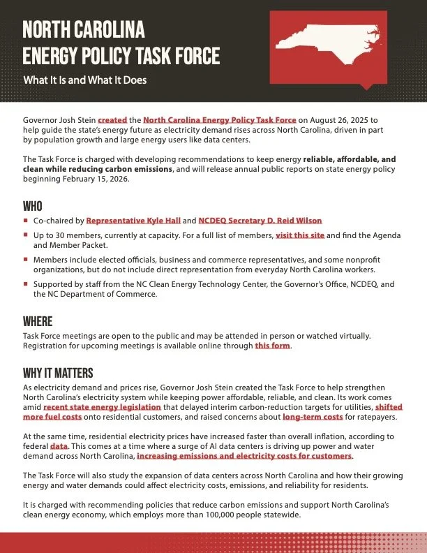 The Governor's Energy Policy Task Force has released its first report on the state of energy policy in North Carolina. Read the release here and review the one-pager below to learn about the Task Force, its purpose, and its structure.