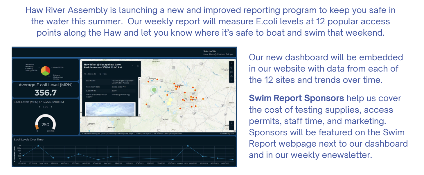 We monitor 12 locations throughout the Haw River watershed every week during the summer (Memorial Day to Labor Day).
